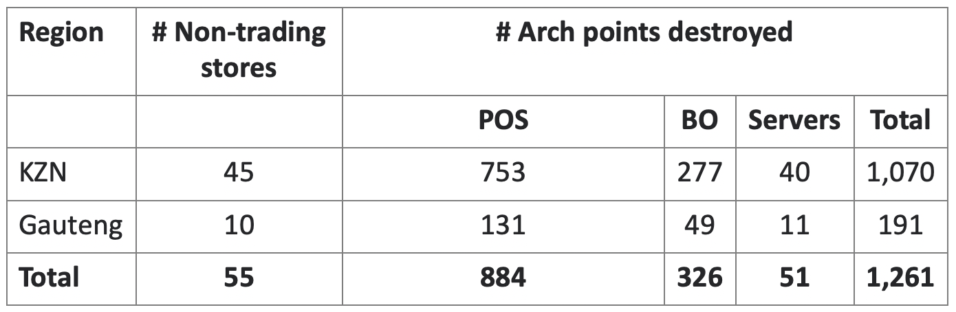 The recent horrific events in Gauteng and especially KZN have left widespread scars and ashes. The following high-level stats reflect the widespread disruption in our Arch family stores: