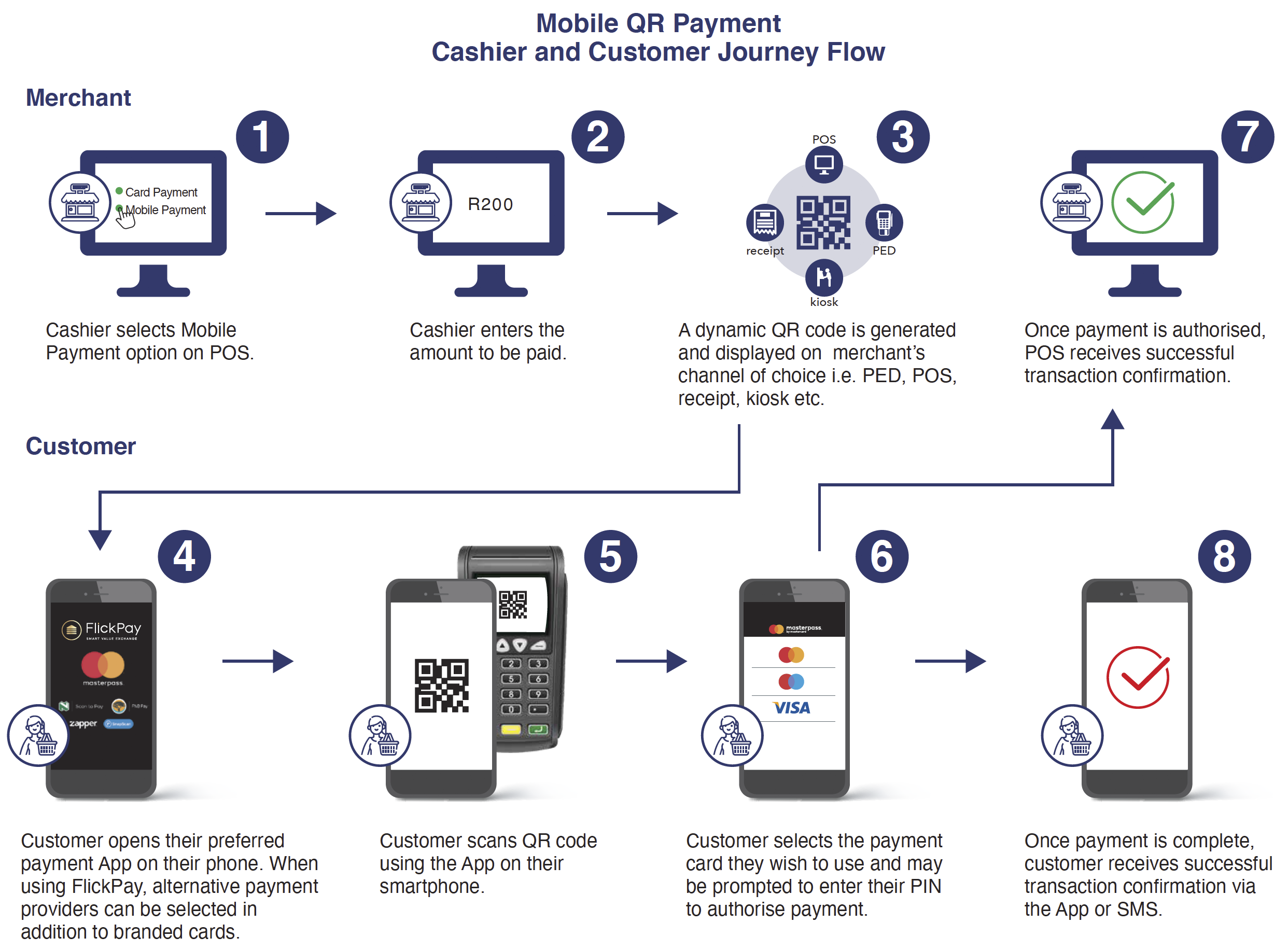 A QR (quick response) code is a 2-dimensional bar code system containing information that can be scanned using the camera on a mobile device. Masterpass uses dynamic QR codes that are generated per transaction and contain unique transaction details such as transaction amount as well as merchant information. These codes are typically displayed on the pin entry device (PED), POS or customer-facing display. They can also be printed on receipts.