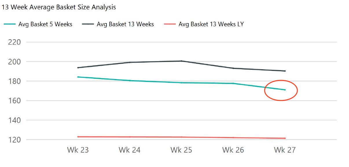 Even though the basket size analysis showed an improvement compared to the previous year, the five-week trend (light blue line above) indicates that there is a downward trend compared to the 13-week trend. It tells store management that action is required to reverse the trend.
