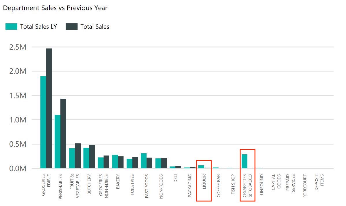 Individual departments must be monitored and managed to improve the overall sales and performance of the store. In the graph below, the effect of COVID-19 is again clearly visible in the liquor and cigarettes departments. The ban on these items during lockdown wiped sales in these departments completely. However, the store could recover these losses elsewhere through effective management.