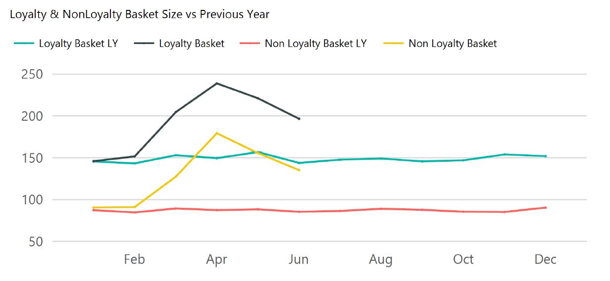 The primary benefit of loyalty cardholders, however, was that they showed a significantly larger basket size, as per the graph below. The effect of COVID-19 from March onwards was the same for loyalty and non-loyalty customers, but the spike was highest for loyalty cardholders.