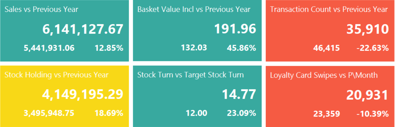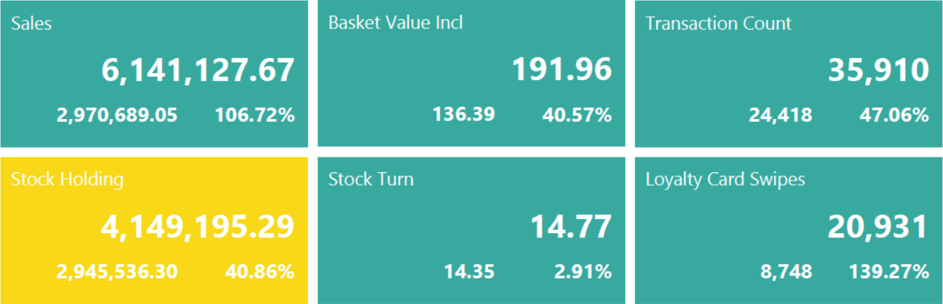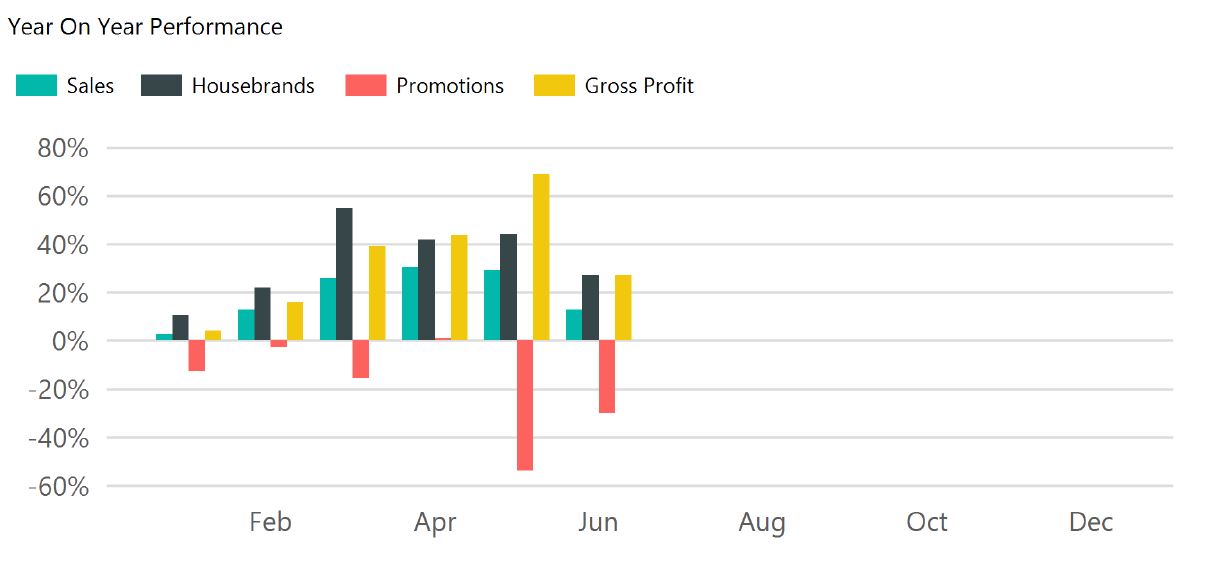 The performance dashboard below compares the key performance indicators (KPIs) of the store for June 2020 with June 2019. The top figure in each block is for June 2020, the bottom left figure for June 2019 and the resultant percentage reflects the change.