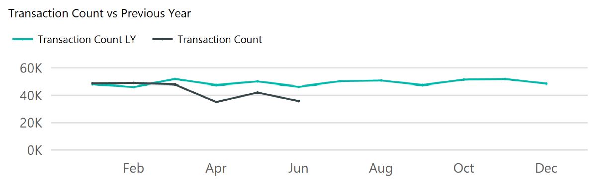 The effect of Covid-19 is visible below in the transaction count drop in March compared to the previous year.